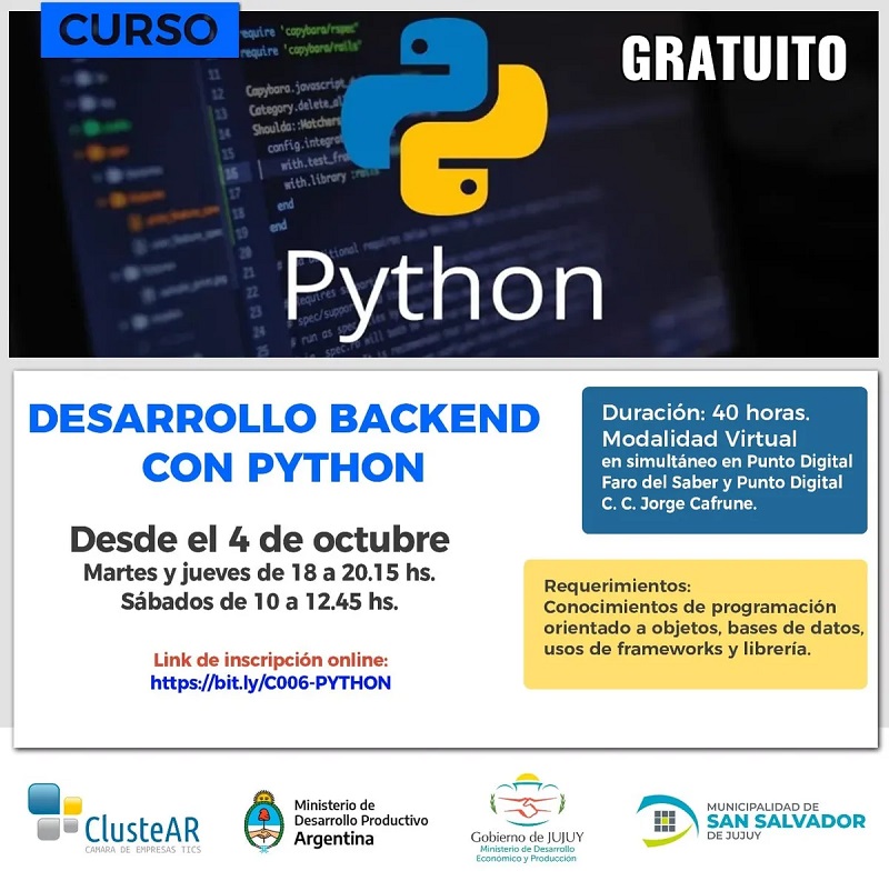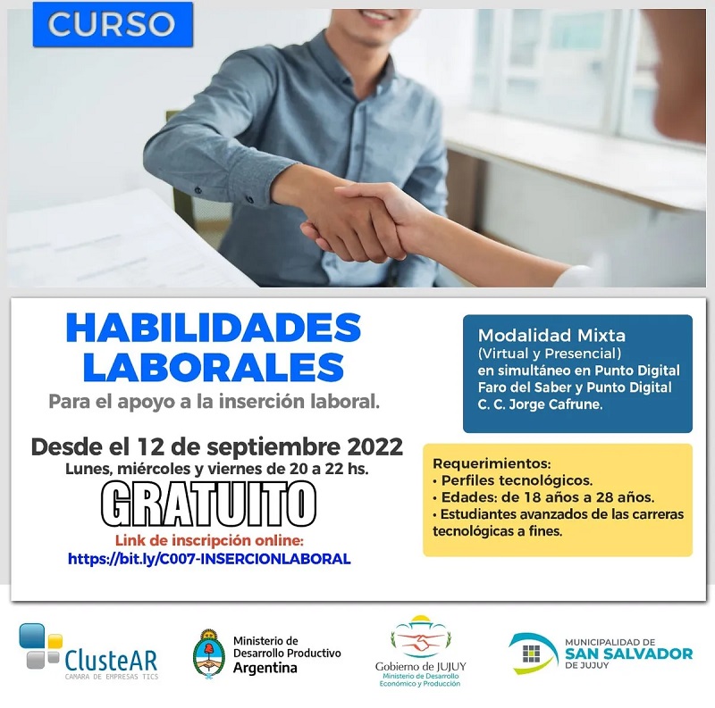 Desde la Dirección Provincial de Servicios Basados en el Conocimiento, del Ministerio de Desarrollo Económico y Producción, se invita a participar del Programa de Inserción Laboral en la Industria del Software en San Salvador de Jujuy, lanzado por el municipio capitalino y que abrió inscripción a tres cursos de formación a dictarse con modalidad híbrida hasta diciembre.