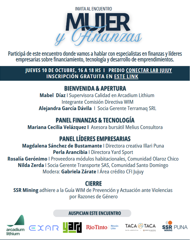 El próximo 10 de octubre desde las 16 horas se realizará el encuentro “Mujer y Finanzas” organizada por WIM Argentina, en el marco del Seminario Internacional de Litio que tendrá lugar en el Predio Conectar Lab de San Salvador de Jujuy.