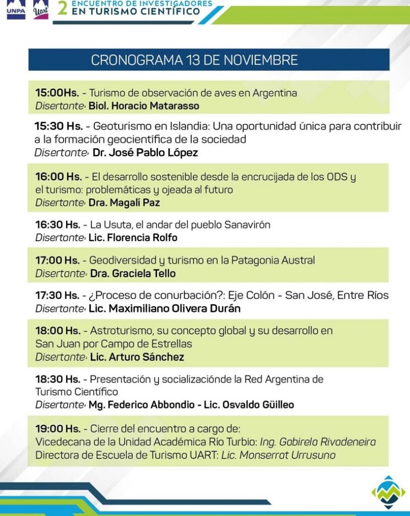 La iniciativa será abordada nuevamente durante el 2° Encuentro de Investigadores en Turismo Científico previsto en la Universidad Nacional de la Patagonia Austral (UNPA) de Río Turbio, los días 12 y 13 de noviembre. Será gratuito y abierto a la comunidad, con el intercambio de experiencias y alternativas sobre este creciente sector y el aporte de diversos profesionales.