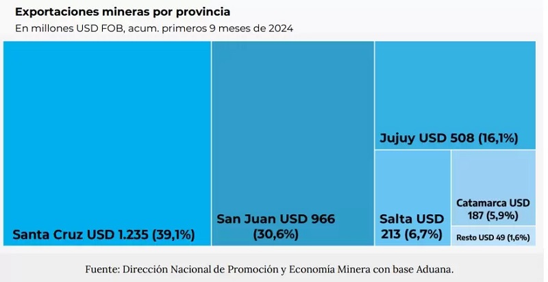 Según datos oficiales, de enero a septiembre Santa Cruz fue la de mayor exportación minera, facturando 1.235 millones de dólares. Le sigue San Juan con 966 millones de dólares, y Jujuy con 508 millones de dólares.