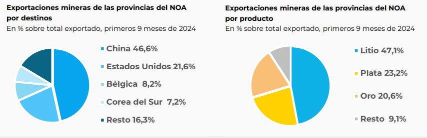 Asimismo, en las provincias del NOA (Jujuy, Salta y Catamarca) las exportaciones mineras de septiembre 2024 alcanzaron los 117 millones de dólares, con un crecimiento interanual de 10,5%; fue explicado por un aumento en los volúmenes exportados del litio.