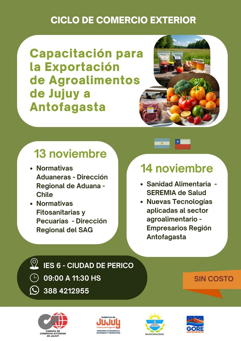 La capacitación para la exportación de Agroalimentos Jujuy – Antofagasta, se efectuará el 13 y 14 de noviembre de 9 a 11:30, en el IES N°6 de la ciudad de Perico. Están convocados principalmente productores, emprendedores y empresas del sector agroalimentario.