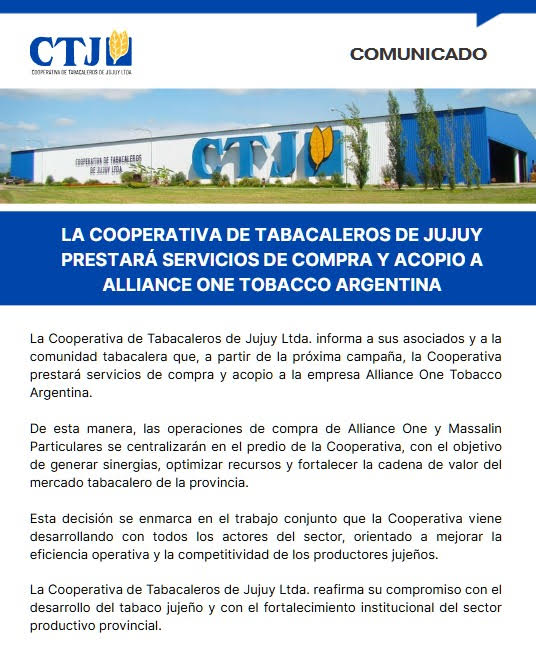 Luego de haberse conocido la decisión de Alliance One Tobacco Argentina de cerrar su planta en Perico, la Cooperativa de Tabacaleros de Jujuy Ltda. anunció que, a partir de la próxima campaña, prestará servicios de compra y acopio a la multinacional.