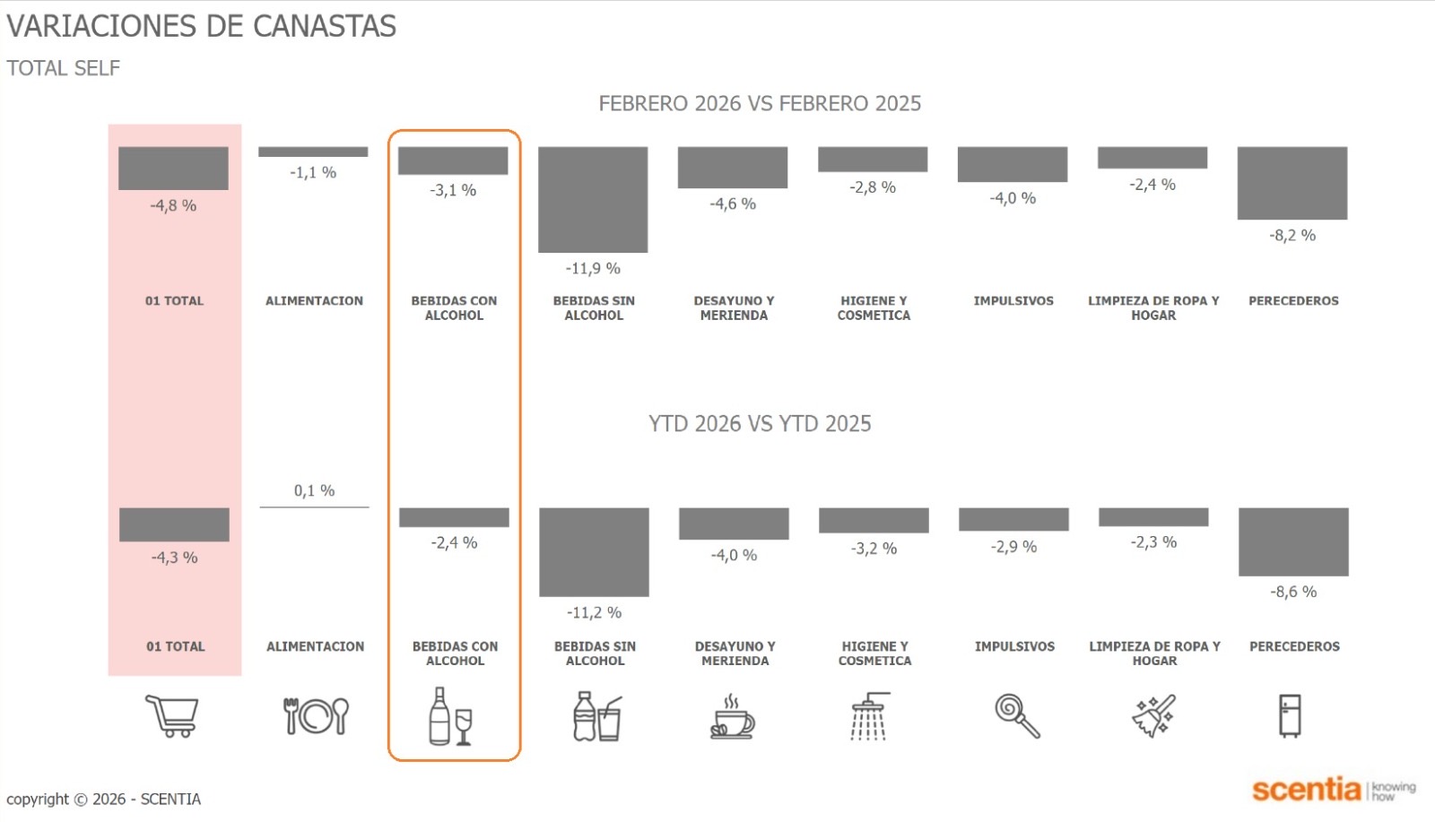 En este contexto, la crisis en lo que respecta al rubro bebidas es particularmente adversa. Es que en febrero de 2026 las ventas en volumen de Bebidas sin Alcohol cayeron 11,8% y acumulan una baja del 10% en el primer bimestre del año, contra igual período de 2025.