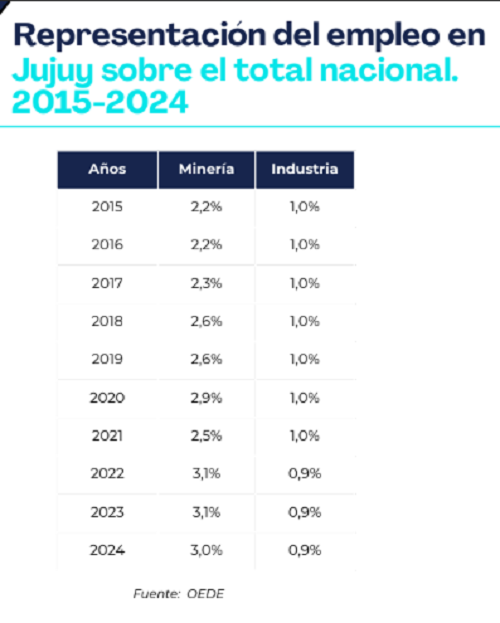 Se confirmó el giro productivo de la provincia, donde la ocupación de mano de obra minera creció fuertemente: “el empleo registrado en la minería mostró un incremento acumulado del 52%", expresó el informe, consolidando su rol creciente en la estructura productiva provincial. En paralelo, sostuvo que la industria retrocedió, marcando que entre 2015 y 2024, el empleo registrado en el sector industrial de Jujuy se redujo en torno al 12% y que ello se reflejó en la composición del empleo provincial.