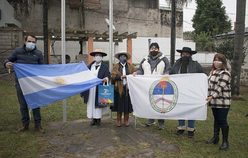 Realizaron en principio el izamiento de la Bandera Nacional y de la Libertad Civil el presidente Lisandro Aguiar, más los concejales Leandro Giubergia, Patricia Moya y María Galán, que después de izamiento entregaron banderas a Irma Sajama del Centro Vecinal “Proyección al Futuro” y Damasia Machaca del Centro Gaucho 8 de Septiembre de Ocloyas. También estuvieron presentes representantes de la Asociación Gaucha.