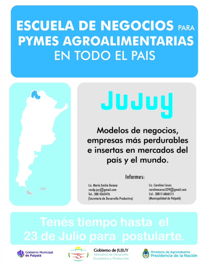 Para más información se deja a disposición los siguientes contactos: Lic. María Emilia Deiana, e-mail Esta dirección de correo electrónico está siendo protegida contra los robots de spam. Necesita tener JavaScript habilitado para poder verlo. Tel.:388 4263476 (Secretaria de Desarrollo Productivo); y Lic. Carolina Casas, e-mail Esta dirección de correo electrónico está siendo protegida contra los robots de spam. Necesita tener JavaScript habilitado para poder verlo. – Cel: 388 156866515 (Municipalidad de Palpalá).