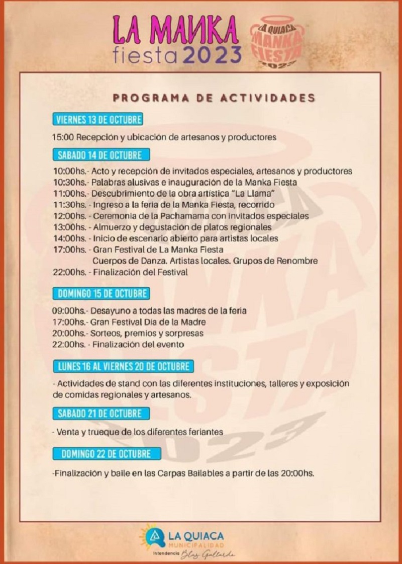 La Quiaca celebra una nueva edición de la Manka Fiesta con música, sabores y homenajes. Todas las actividades en torno a esta edición 2023 se realizarán en el predio del exferrocarril de la ciudad de La Quiaca y culminará el día 20 de octubre.
