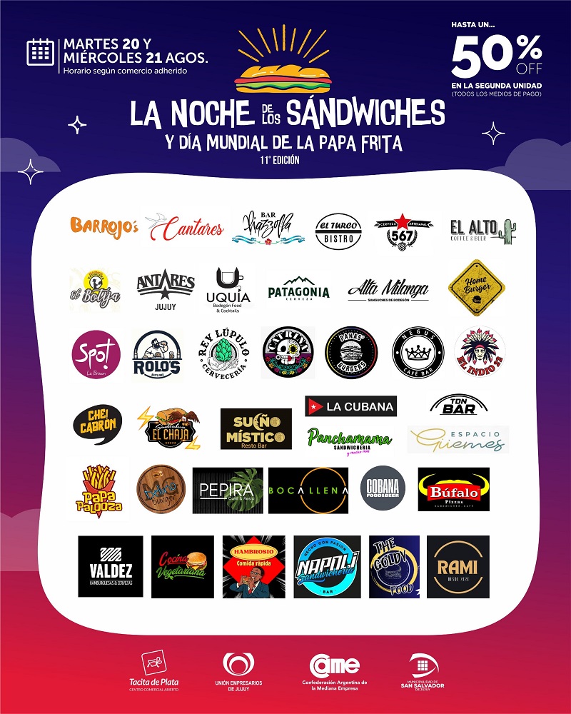 Ante la celebración del "Día Mundial de la Papa Frita" el 20 de agosto, y la 11° Edición de la “La Noche de los Sándwiches”, el 21 de agosto, los comercios que se sumarán a esta propuesta son: