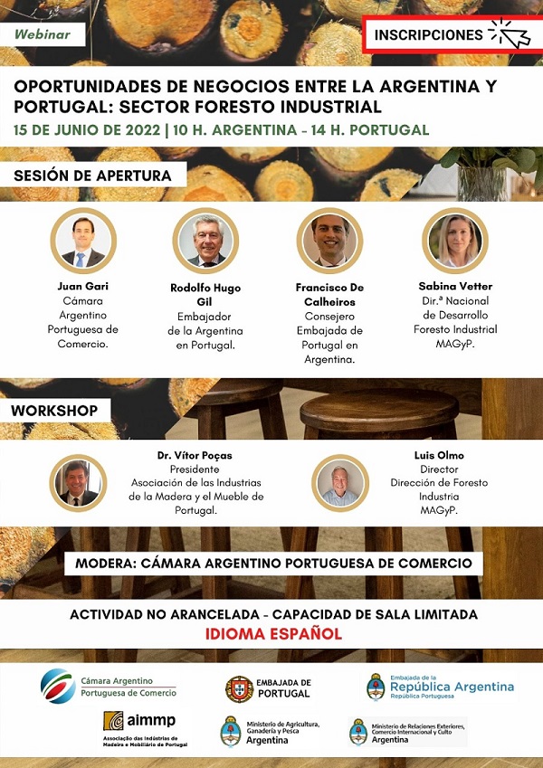 El encuentro on line iniciará a las 10 horas de Argentina y 14 horas Portugal, con la apertura a cargo de la Cámara Argentino Portuguesa de Comercio; la Embajada de la Argentina en Portugal, a cargo de Hugo Gil; la Embajada de Portugal en Argentina, cuyo Consejero es Francisco de Calheiros; y la Directora de Desarrollo Foresto Industrial de la Nación, Sabina Vetter, por el Ministerio de Agricultura, Ganadería y Pesca de la República Argentina.