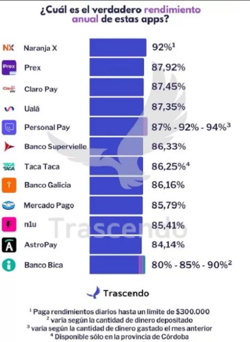 Según el relevamiento, Naranja X lidera el ranking con una tasa anual del 92%, aunque este rendimiento aplica solo hasta un límite de $300.000, luego de lo cual disminuye al 50%.