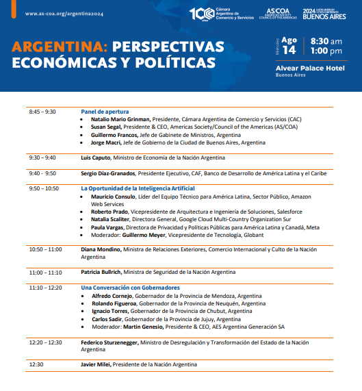 Con la confirmación del Presidente de la Nación, Javier Milei, se completó la nómina de los funcionarios y empresarios que disertarán este miércoles 14 en el Council of the Americas, conferencia organizada en el país por AS/COA en asociación con la Cámara Argentina de Comercio y Servicios. Será panelista además el gobernador de Jujuy, Carlos Sadir, y empresas vinculadas a Inteligencia Artificial.