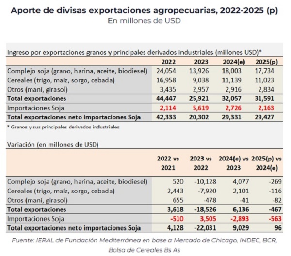 En cuanto al aporte de divisas que puede generar el sector agroexportador en 2025, si bien falta mucho y dependerá no sólo de los precios sino también de las cosechas (va a ser muy importante que el clima acompañe), para el IERAL un primer escenario de trabajo estima exportaciones por USD 31,6 mil millones, casi USD 500 millones por debajo de las exportaciones que se lograrían este año (-1,5%). Si el número anterior se ajusta por el menor gasto en las compras de soja a países vecinos, una práctica habitual de la industria aceitera argentina en los últimos años, la caída de divisas se revierte, quedando el flujo neto prácticamente neutro, al mismo nivel que el que se estima para este año (en torno a USD 29,4 mil millones).