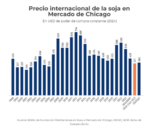 Para tener perspectiva, los valores que se están manejando en el mercado de la soja para el próximo año se ubican bastante por debajo del promedio de últimos 25 años (USD 480/ton, en poder de compra constante), y hay que volver hasta el 2006 para encontrar un mercado con precios tan deprimidos.