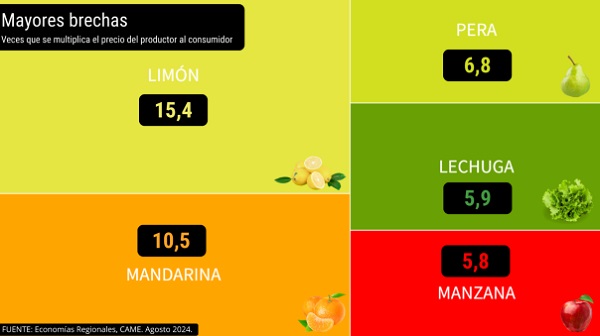 El limón (15,4 veces), la mandarina (10,5), la pera (6,8), la lechuga (5,9) y la manzana roja (5,8), fueron los 5 productos que presentaron mayor diferencia entre los precios de origen y destino, según la CAME.