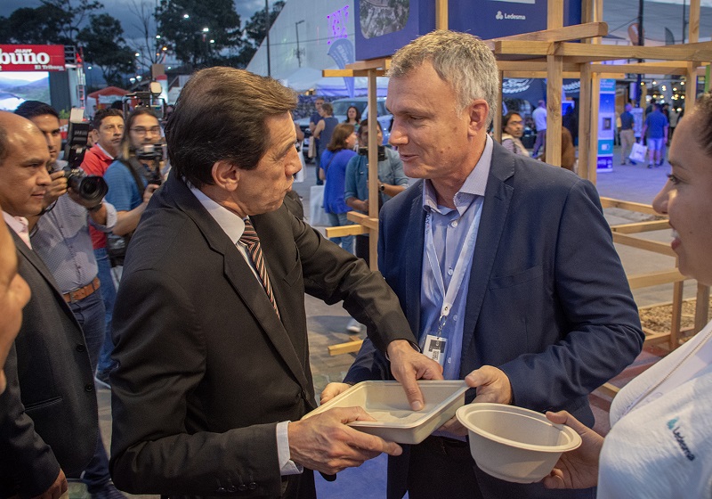 La vajilla sustentable fue presentada por el administrador general de la firma, Federico Gatti, al gobernador de la provincia, Carlos Sadir.