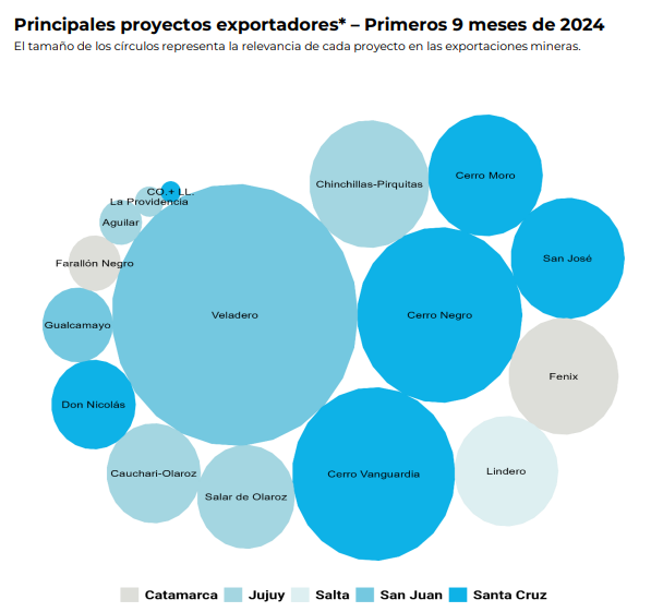 Según datos oficiales, de enero a septiembre Santa Cruz fue la de mayor exportación minera, facturando 1.235 millones de dólares. Le sigue San Juan con 966 millones de dólares, y Jujuy con 508 millones de dólares.
