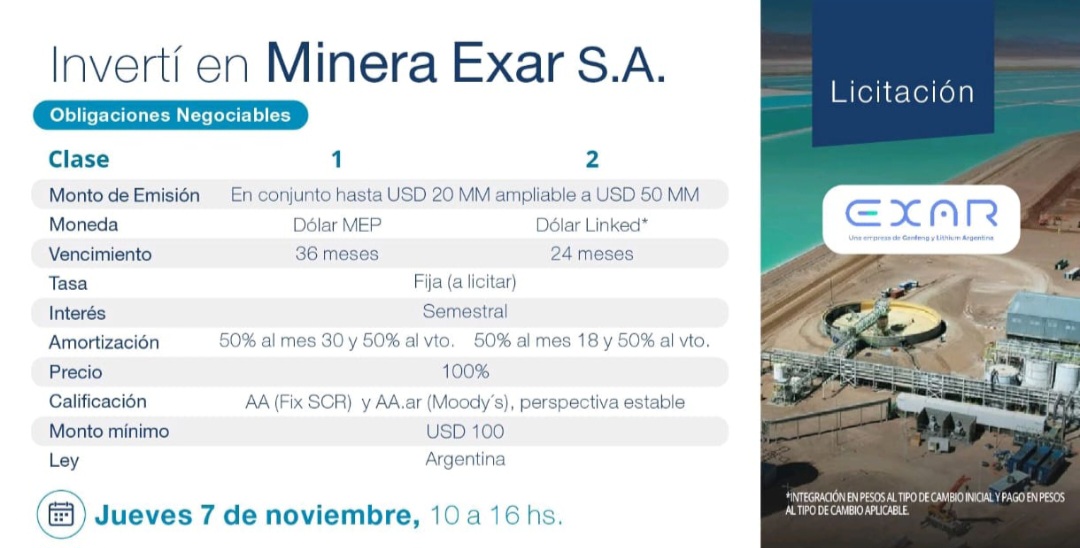 EXAR, empresa líder en la producción de carbonato de litio de la Argentina, colocó su primera emisión de obligaciones negociables (ON) por un monto equivalente a USD 50 millones, superando su objetivo inicial de USD 20 millones.