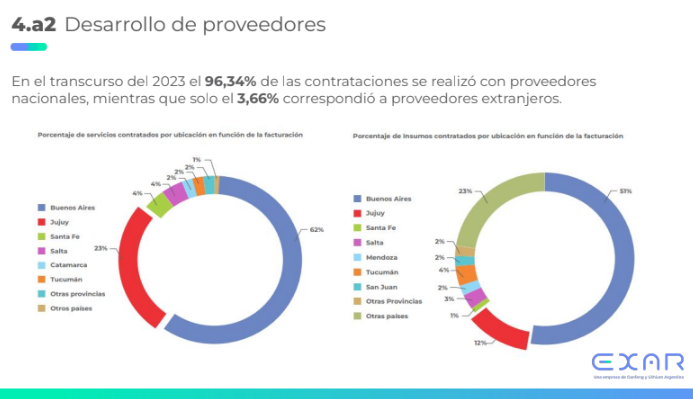 EXAR, empresa conformada por Ganfeng Lithium, Lithium Argentina y Jujuy Energía y Minería Sociedad del Estado (JEMSE), alcanzó su primer hito en junio de 2023 al iniciar la producción y exportación del carbonato de litio, en la planta de Cauchari - Olaroz. Este logro se tradujo en un aporte a la economía argentina que superó los 95.000 millones de pesos, lo que representa un incremento del 234% en comparación con el año anterior. A nivel local, la inversión en Jujuy alcanzó los 20.000 millones de pesos, un 235% más que en 2022, según precisó el reporte privado.