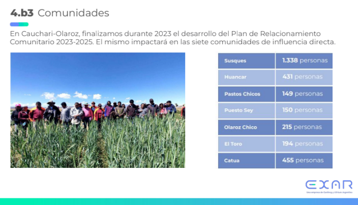 En 2023, EXAR invirtió 188 millones de pesos en diversos programas de Relaciones con la Comunidad, beneficiando directamente a cerca de 3.000 personas de las siete comunidades originarias cercanas a la planta.