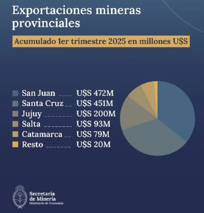 Según la Secretaría de Minería de la Nación, las exportaciones mineras representaron el 7,4% del total nacional entre enero y marzo, con un crecimiento interanual del 51,9%. En marzo, las ventas al exterior alcanzaron US$479 millones, un 47% más que en 2024, equivaliendo al 7,9% de las exportaciones totales del país.