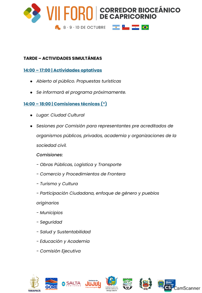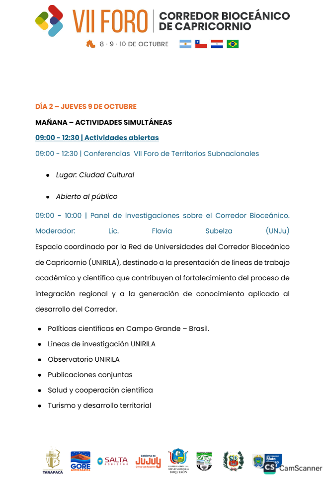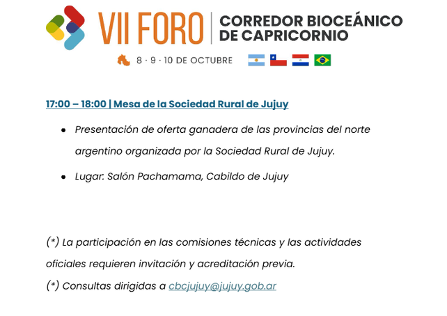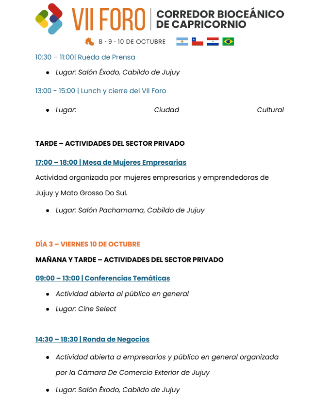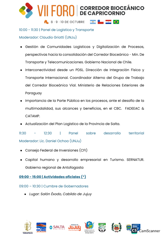 Con la mirada puesta en la integración del Cono Sur, Jujuy es sede del VII Foro del Corredor Bioceánico de Capricornio. Hasta el 10 de octubre reunirá a delegaciones de Argentina, Brasil, Chile y Paraguay para debatir proyectos de integración regional y desarrollo económico.