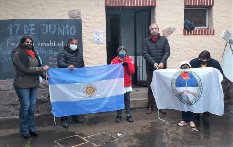 Realizaron en principio el izamiento de la Bandera Nacional y de la Libertad Civil el presidente Lisandro Aguiar, más los concejales Leandro Giubergia, Patricia Moya y María Galán, que después de izamiento entregaron banderas a Irma Sajama del Centro Vecinal “Proyección al Futuro” y Damasia Machaca del Centro Gaucho 8 de Septiembre de Ocloyas. También estuvieron presentes representantes de la Asociación Gaucha.