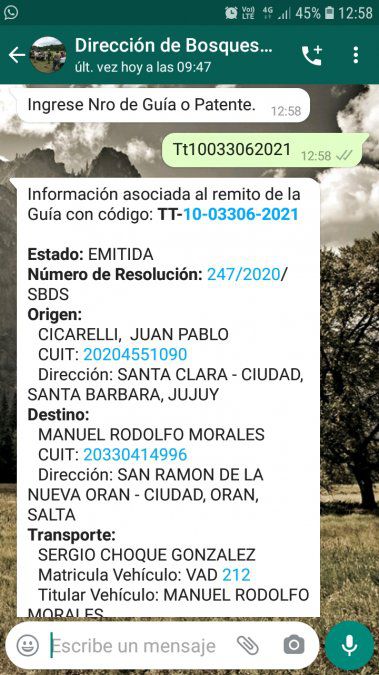 Concretamente, se trata de un chatbot vía WhatsApp, a través del cual se valida de forma instantánea la legalidad y vigencia de las guías de tránsito de madera nativa emitidas por la Dirección de Bosques del Ministerio de Ambiente de Jujuy, con la posibilidad de atender varias consultas a la vez las 24 horas del día. Mediante este servicio además se agiliza el proceso de consulta de números de guías con productos forestales (guías).