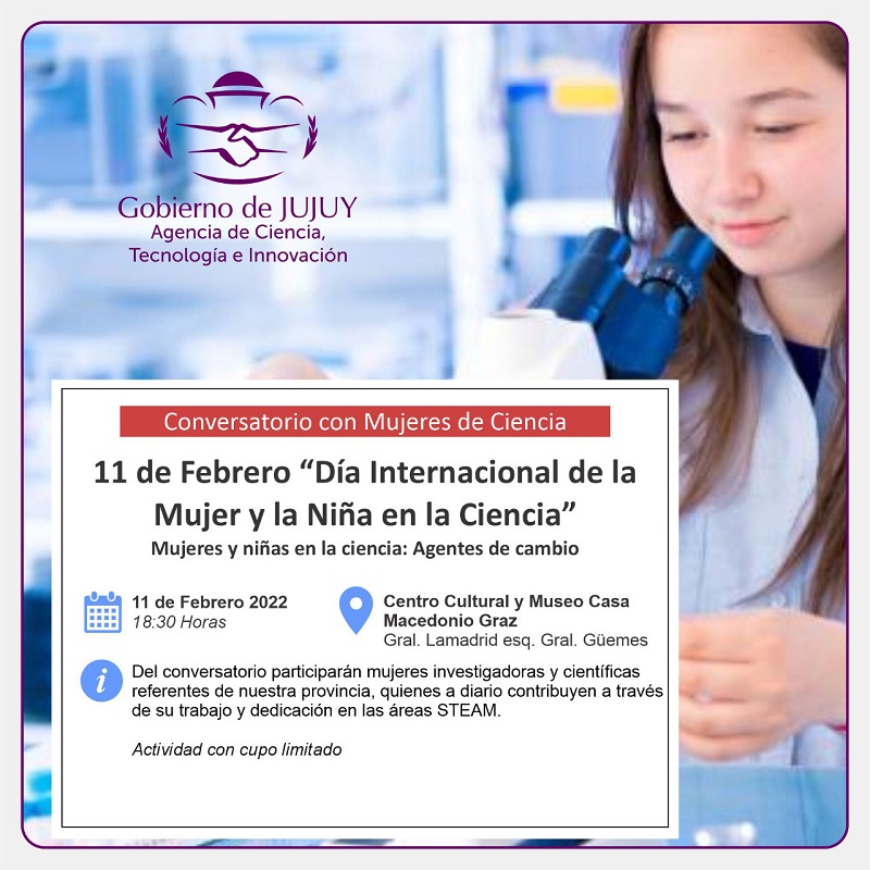 En el marco de la conmemoración del “Día Internacional de la Mujer y la Niña en la Ciencia”, se realizará el primer conversatorio con la participación de mujeres investigadoras y científicas de Jujuy, que se darán cita este viernes 11 de febrero desde las 18.15 en el Centro Cultural y Museo Casa Macedonio Graz de ciudad capital.