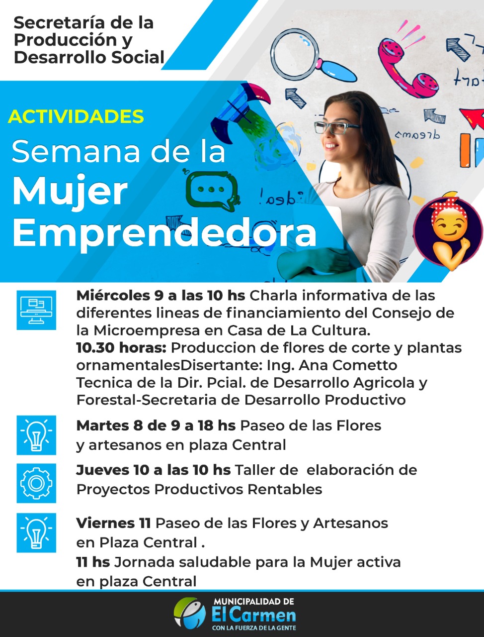 En el marco del Día internacional de la Mujer: las actividades organizadas por la Secretaría de Producción y Desarrollo Social de la Municipalidad del Carmen, comenzarán el martes 8 y se extenderán hasta el viernes 11 de marzo, donde las mujeres emprendedoras de nuestra provincia podrán participar de un ciclo de charlas y jornadas que abarcarán las temáticas más importantes para iniciar o potenciar sus emprendimientos.