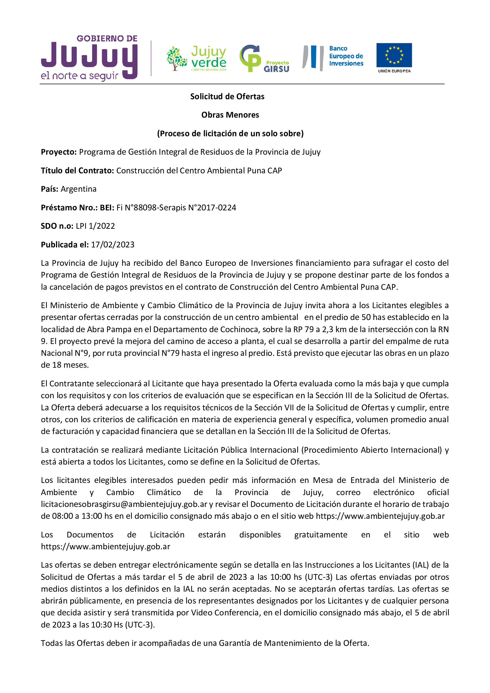 El Ministerio de Ambiente y Cambio Climático de la Provincia de Jujuy invita a licitantes elegibles a presentar ofertas cerradas por la construcción de un centro ambiental en la localidad de Abra Pampa, Departamento de Cochinoca.