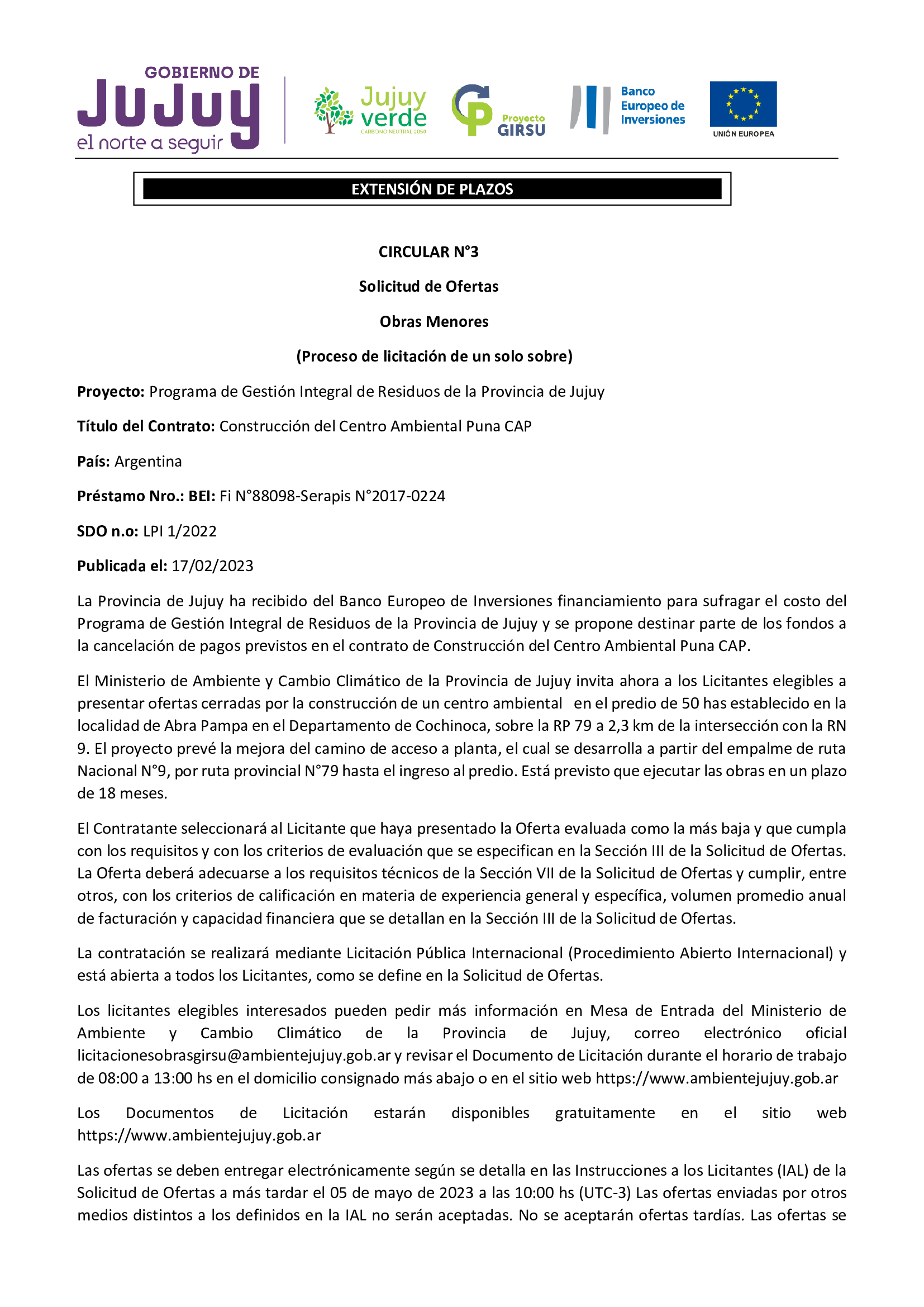 Como parte del Programa de Gestión Integral de Residuos de la Provincia, el Ministerio de Ambiente y Cambio Climático de Jujuy convoca a licitantes elegibles para obras en el Centro Ambiental Puna CAP.