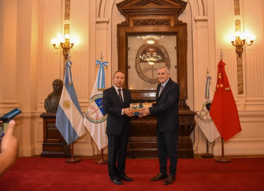 El gobernador de Jujuy, Gerardo Morales, recibió en el Salón de la Bandera de la Casa de Gobierno al embajador de la República Popular China en Argentina, Wang Wei.