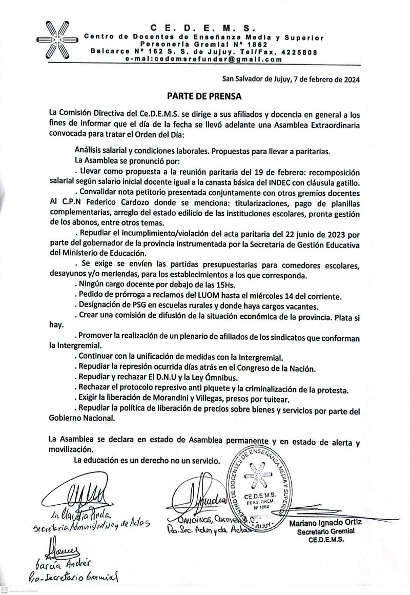 En vísperas de estas reuniones, el CEDEMS señaló que se exigirá como piso salarial el costo de la canasta familiar -que según el INDEC ronda los 500 mil pesos- sumado a una cláusula gatillo frente al escenario inflacionario.