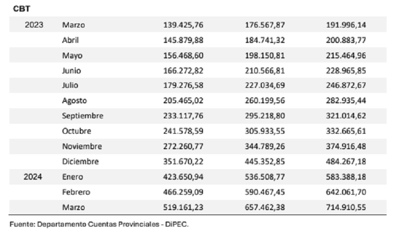 En cuanto a la variación interanual, de marzo 2023 a marzo del 2024, de la CBA fue de 267,1% y de la CBT resultó 272,4%.