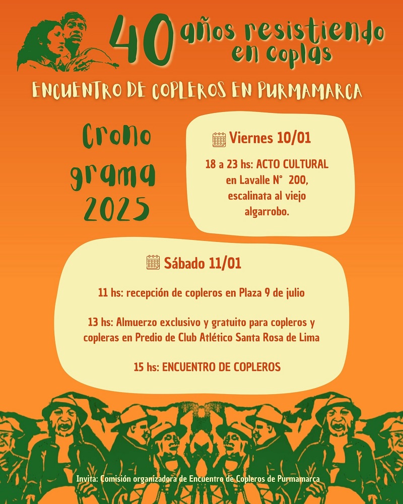 En defensa de la cultura popular, la identidad y “lejos de intereses económicos y partidarios”, se ultiman detalles para el Encuentro de Copleros en Purmamarca, con un acto inaugural el día 10 y las tradicionales rondas en plaza 9 de julio el próximo 11 de enero.