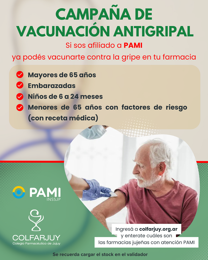 El Colegio Farmacéutico de Jujuy recordó que la vacuna es gratuita, segura y está disponible para todos los afiliados de PAMI en las farmacias adheridas.