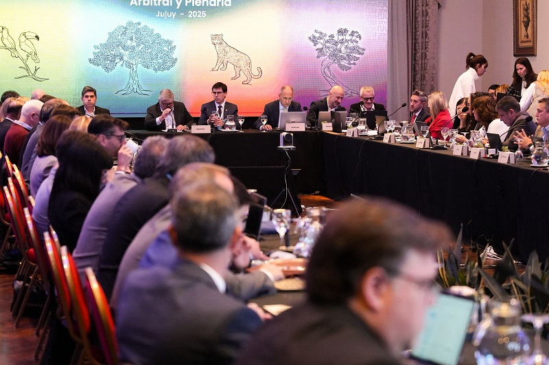 El presidente del bloque de diputados del Frente Cambia Jujuy, Santiago Jubert, junto a los diputados, Adriano Morone, Gisel Bravo y Agustina Guzmán participaron de la Reunión de la Comisión Arbitral y Plenaria, que se desarrolla en Jujuy, bajo la organización del Ministerio de Hacienda local.