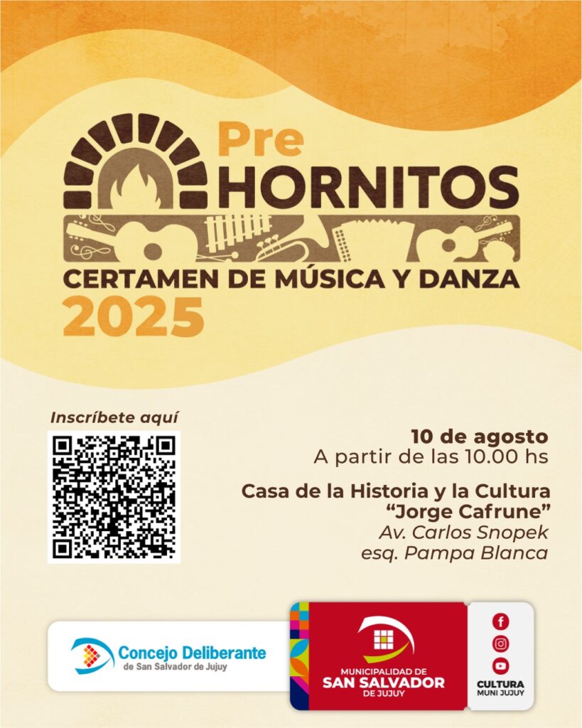 Prosigue la oportunidad para interesados en participar en el Certamen Folklórico Pre Hornitos 2025, evento impulsado por la Municipalidad de San Salvador de Jujuy -a través de la Secretaría de Cultura y Turismo- y el Concejo Deliberante. La iniciativa busca promover la diversidad cultural y brindar oportunidades a músicos y bailarines emergentes de la provincia.