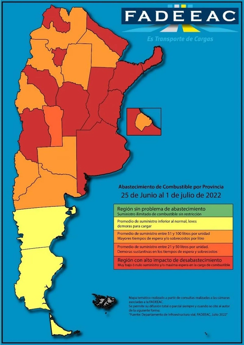 En el "Mapa de abastecimiento de gasoil" que elabora la entidad, es la primera vez que no aparece un distrito sin problemas de abastecimiento. Este mapa se conforma a través de las respuestas de conductores y propietarios de camiones de algunas de las 4.500 pymes que integran las 44 Cámaras de transporte enroladas en la Federación y la información refleja lo ocurrido en las semanas anteriores. En el informe anterior (reflejó lo que ocurría entre el 15 y 25 de junio) sólo Tierra del Fuego aparecía en verde pleno (color con el que se identifica a las provincias que no sufren restricción alguna para el repostaje de combustible). Hasta entonces, las provincias hidrocarburíferas de la Patagonia lograban escapar del faltante que afecta de modo especial a la zona centro y norte de la Argentina. Sin embargo, el "efecto manta corta" -desviar combustible desde el Sur para intentar compensar la situación de las regiones más complicadas- hizo que también allí aparecieran cupos y se extendieran los tiempos de espera para repostar.