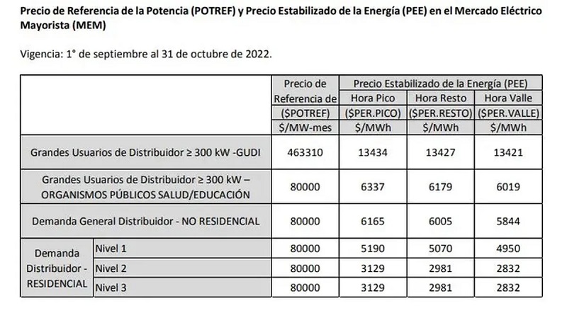 Por último, los precios para la hora valle para el bimestre septiembre-octubre serán de $ 2.832 para los niveles 2 y 3, $ 4.950 para el nivel 1, $ 5.844 para los no residenciales, $ 6.019 para organismos públicos, salud y educación y $ 13.421 para los GUDI.