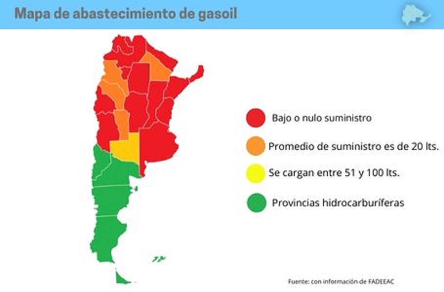 Según el informe presentado por la Federación Argentina de Entidades Empresarias del Autotransporte de Cargas (FADEEAC), las provincias que integran el NEA y NOA están en situación crítica con bajo o nulo abastecimiento y otras con restricciones de venta.